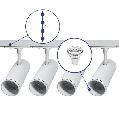 Beschreibung Komplettset 1-Phasen Rail 2 Meter Weiß | incl. 4x Spot + GU10 2700K 3W Dimmbar + Abschlusskappe, Stromanschluss und I-Verbinder