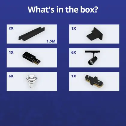 Beschreibung Komplettset 1-Phasen Rail 3 Meter Schwarz | incl. 6x Spot + GU10 2700K 3W Dimmbar + Abschlusskappe, Stromanschluss und I-Verbinder