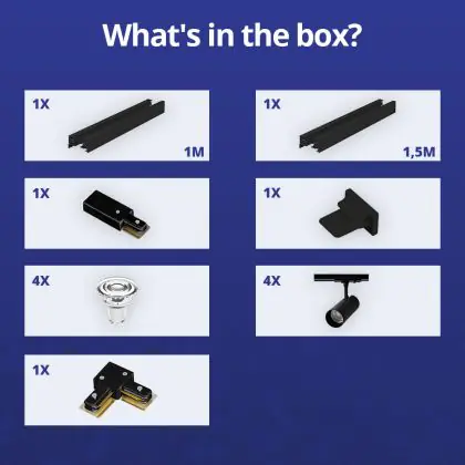 | Herstellername | Complete L shaped 1-Phase Track Set Black incl. 4x Spot fixture + GU10 2700K 3W Dim - 1 x 1,5 meter | |