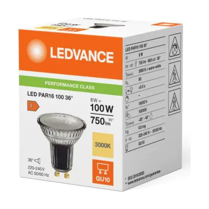 Die Ledvance LED PAR16 GU10 Reflektor 8W 750lm 36D - 830 Warmweiß | Ersatz Für 80W ist eine effiziente GU10 LED-Lampe und der perfekte Ersatz für Ihre konventionelle Halogenlampe mit 80W und einem GU10-Sockel, bei welchem die zwei Stifte einen Abstand von 10 mm zueinander haben. Zudem strahlt das Produkt Licht in der Farbtemperatur 3000K - Warmweiß aus und punktet durch eine lange Lebensdauer.