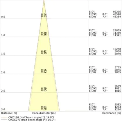 Beispiel: Wird eine Lampe mit einem Abstrahlwinkel von 60 Grad an der Decke (2,5 m Höhe) angebracht, erzeugt sie einen Lichtkegel von 2,9 Metern Durchmesser. Hat die Lampe hingegen einen Abstrahlwinkel von 120 Grad, beträgt der Lichtkegel 8,7 Meter im Durchmesser. |