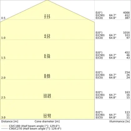 Beispiel: Wird eine Lampe mit einem Abstrahlwinkel von 60 Grad an der Decke (2,5 m Höhe) angebracht, erzeugt sie einen Lichtkegel von 2,9 Metern Durchmesser. Hat die Lampe hingegen einen Abstrahlwinkel von 120 Grad, beträgt der Lichtkegel 8,7 Meter im Durchmesser. |