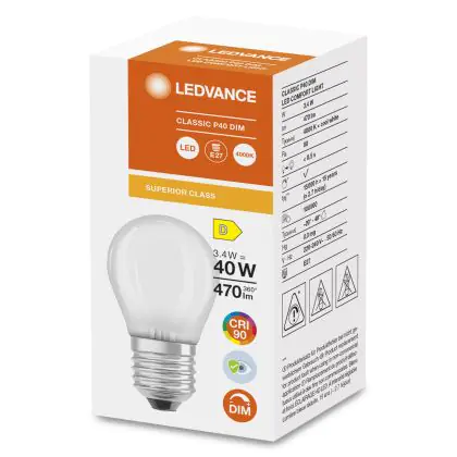 Die Ledvance Superior Classic LED E27 Kugel Matt 3.4W 470lm - 940 Kaltweiß | Dimmbar - Höchste Farbwiedergabe ist eine effiziente E27 LED-Lampe und der perfekte Ersatz für Ihre konventionellen 40W Lampen mit E27-Sockel. Zudem strahlt sie Licht in der Farbtemperatur 4000K - Kaltweiß aus und punktet durch eine lange Lebensdauer.