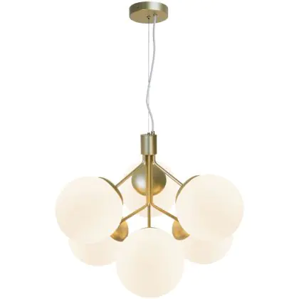 Bei der Pendelleuchte Ivona handelt es sich um eine Neuinterpretation eines klassischen Kronleuchters, wobei das traditionelle Design durch einen etwas organischeren und moderneren Look akzentuiert wird. Mit 6 Glaskugeln strahlt Ivona ein tolles Licht aus, das für einen modernen und extravaganten Stil sorgt. Die Kombination aus Messing und Opalglas schafft einen glamourösen und eleganten Designausdruck. Das Glas dieser Leuchte ist mundgeblasen und handgefertigt. Aufgrund dieses einzigartigen Verfahrens können im Glas Luftblasen entstehen und die Dicke des Glases kann ebenfalls variieren. Dies verleiht dem Glas seinen einzigartigen Charakter und sein lebendiges Erscheinungsbild.