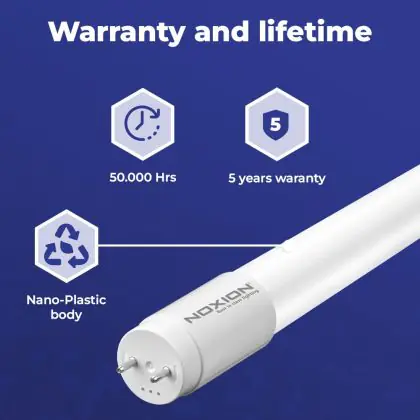 Mit der T8 LED-Röhre von Noxion können Sie neben rund 70 % Energiekosten auch ordentlich Wartungs- und Austauschkosten sparen. Das liegt an ihrer langen Lebensdauer von 50000 Stunden: Eine konventionelle Leuchtstoffröhre kommt gerade einmal auf ungefähr 24.000 Stunden und muss somit viel öfter gewechselt werden als ihr LED-Pendant.