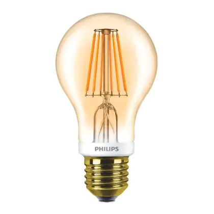 Die Philips Classic LED Glühbirne E27 Birne Gold 7.5W 600lm - 820 Extra Warmweiß | Dimmbar - Ersatz für 60W ist eine effiziente E27 LED-Lampe und der perfekte Ersatz für Ihre konventionellen 48W Lampen mit E27-Sockel. Zudem strahlt sie Licht in der Farbtemperatur 2000K - Extra Warmweiß aus und punktet durch eine lange Lebensdauer.