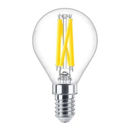 Die Philips MASTER LED E14 Kugel Fadenlampe Klar 5.9W 806lm - 922-927 Dim To Warm | Höchste Farbwiedergabe - Dimmbar - Ersatz Für 60W ist eine effiziente E14 LED-Lampe mit Retrodesign und der perfekte Ersatz für Ihre konventionellen 60W Lampen mit E14. Zudem strahlt sie Licht in der Farbtemperatur 2200K - 2700K Dim To Warm aus und punktet durch eine lange Lebensdauer.